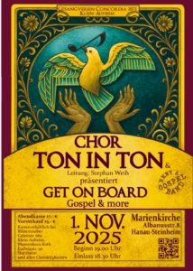 unter dem Motto „Get on Board“ hat Chorleiter Stephan Weih ein außergewöhliches Set an Gospel und Pop Songs im Gospel-Sound, 5-stimmig arrangiert. Der über 50-köpfige, gemischte Chor „Ton in Ton“ der Concordia Klein-Auheim, freut sich darauf, Sie am Samstag, den 1. November, 19:00 Uhr, in der Marienkirche, Albanusstraße 8, in Steinheim in vorweihnachtliche Stimmung zu bringen. Begleitet von der 4-köpfigen „Rent a Gospelband“ wird das sicher wieder ein unvergesslicher Abend. Die Tonis freuen sich schon darauf Sie begrüßen zu können. Im Anschluß daran heissen sie ihre Gäste gern im Kardinal-Volk-Haus, direkt nebenan, zu einem gemeinsamen Umtrunk herzlich willkommen.