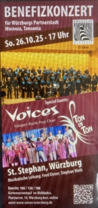 Vorfreude auf unseren Ausflug nach Würzburg mit Auftritt in der St.Stephan Kirche. Gemeinsam mit den „Voices“ treten wir zugunsten der Hilfsorganisation Mwansa, der Schwesterstadt von Würzburg in Tansania, auf.