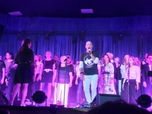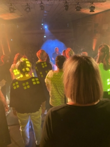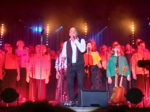 Der Pulsschlag steigt, das Konzert nimmt Fahrt auf mit Falco und fernen Galaxien und der ganz eigenen Philosophie der Neuen Deutschen Welle (Achziger Jahre). Wir finden uns im Sternenhimmel wieder und haben die Welt vergessen. Stefan Weih und Joscha Moreth, Frontmann der Hanauer Band „Dinners“, sind Freunde und so steht Joscha als Gast mit dem Chor auf der Bühne und performt zusammen mit Dominique Frühauf „Gold“, ein Liebeslied aus eigener Feder. Das Publikum ist hingerissen, feiert den Klein-Auheimer, der die Arme hebt und sich strahlend bei der Band, dem Chor und allen bedankt. Was kann jetzt noch kommen, um das zu toppen? Am Sonntag der Oberbürgermeister in spé,