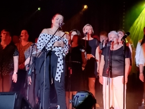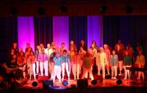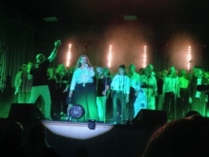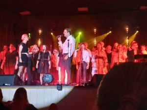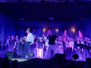 Weiter geht die musikalische Reise, „You can‘t hurry Love“ von den Supremes (1966), gesungen vom jüngsten Chormitglied Davinia Martin und „September“ (1978) dem Klassiker der US-amerikanischen Band Earth, Wind & Fire, in einer eigenen Interpretation von Thomas Frühauf, Die Augen blitzen, eine Vorfreude steht in den Gesichtern des Chors, die Band stimmt an und das Publikum lässt sich gern anstecken von Rhythmus und Gesang: „No roots“ (Alice Merton, 2016) ist eine feste Größe im Repertoire von „Ton in Ton“ und alle haben so viel Spaß mit dem Lied und der ganze Saal auch und der Dirigent tigert über die Bühne als gäb‘s Kilometergeld. Wer danach an Verschnaufen denkt, hat sich getäuscht. „Everybody“ (Backstreet Boys, 1997), gefolgt von Filmmusik, zum ersten Mal, sagt Stefan Weih und führt den Chor musikalisch mitreißend durch den Kultfilm „Dirty Dancing“ (1987). Nicht nur Patrick Swayze und Jennifer Grey, die Hauptfiguren des Films, haben eine unvergessliche Zeit, auch Stefan Weih nimmt vorweg, worum es an diesem Abend in der TSV-Halle für alle geht: „The time of my Life“, alle haben hier und jetzt für ein paar Stunden die Zeit ihres Lebens. Allerdings brauchen Chorleiter, Chor und Zuschauer erstmal eine Pause. Wie ein Rausch ist der erste Teil des Konzerts verflogen, meine Güte wo ist denn die Zeit geblieben!