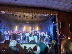 Die Höhepunkte reihen sich wie Perlen an einer Kette, getragen vom Chor als Basis und Fundament, der den Solisten Sicherheit schenkt und selbstbewusst performt. Immer unterstützt von der Band „Rent a Gospel Band“, die scheinbar mühelos Akzente setzt und mal eben ein grandioses Gitarrensolo einfließen lässt. Musik hat die Kraft Menschen zusammen zu bringen, Brücken zu bauen und die Synapsen im Gehirn neu zu verdrahten – und gerade jetzt brauchen wir Brückenbauer und solche Abende, die die Fantasie anregen und die Gemeinschaft stärken. Die Rockballade “My immortal” (Evanescence 2003) scheint nicht von dieser Welt, die Zuschauer halten den Atem an als Lucja Huml und Dominique Frühauf eine intime Stimmung kreieren, und Thomas Klein Purple Rain (Prince 1984) in einer ganz eigenen Interpretation performt.