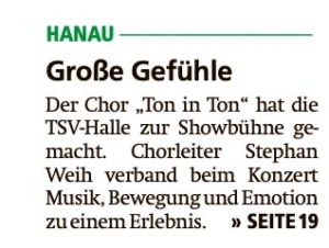 Für ein paar Stunden bebt der Boden, pulsiert die Energie und mehr als dreihundert Menschen fühlen sich verbunden und so wunderbar lebendig in der TSV-Halle in Klein-Auheim. “Mixtape“ ist das Motto des Konzertabends des Concordia Chors „Ton in Ton“, und alle sind jetzt bereit für einen ganz besonderen Abend unter der Leitung des Dirigenten Stefan Weih, der mit „Higher and Higher“ schon andeutet, in welche Richtung es geht. Der Chor hält, was er verspricht. Mehr als fünfzig Jahre Musikgeschichte wirken frisch wie am ersten Tag und von Beginn an singt das Publikum mit. Der Dirigent tanzt, springt, hopst und kann es kaum glauben: Das Publikum singt mit, ganz von alleine: „Die können richtig gut singen…“, immer wieder schüttelt er überrascht den Kopf, kanns kaum glauben, saugt die Energie des Abends förmlich auf. Das Gospel-Medley, eine Zusammenfassung des Kirchenkonzerts vom November in Steinheim, ist solistisch betont ohne den Chor zu verlieren. Wie überhaupt der ganze Abend die Botschaft vermittelt, das Geheimnis, wenn man es so nennen will, das Geheimnis von „Ton in Ton“ und Stefan Weih ist die pure Freude an der Musik, am Singen, an der Gemeinschaft, ist generationenübergreifend, und der entscheidende Rest bleibt Magie…